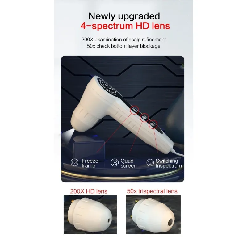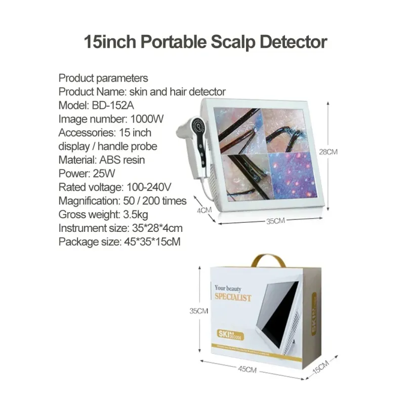 Der HD Digital Skin Analyzer ist mit modernster Technologie ausgestattet, um hochauflösende Bilder und genaue Analysen zu liefern. Er verfügt über ein 15-Zoll-HD-Display, eine 50-fache UV-Lichtlinse und eine 200-fache Weißlichtlinse, die eine detaillierte Untersuchung der Kopfhaut und der Haut ermöglichen. Egal, ob Sie Haarfollikelprobleme diagnostizieren, chemische Rückstände erkennen oder Hauterkrankungen analysieren, dieses Gerät bietet beispiellose Klarheit und Präzision.