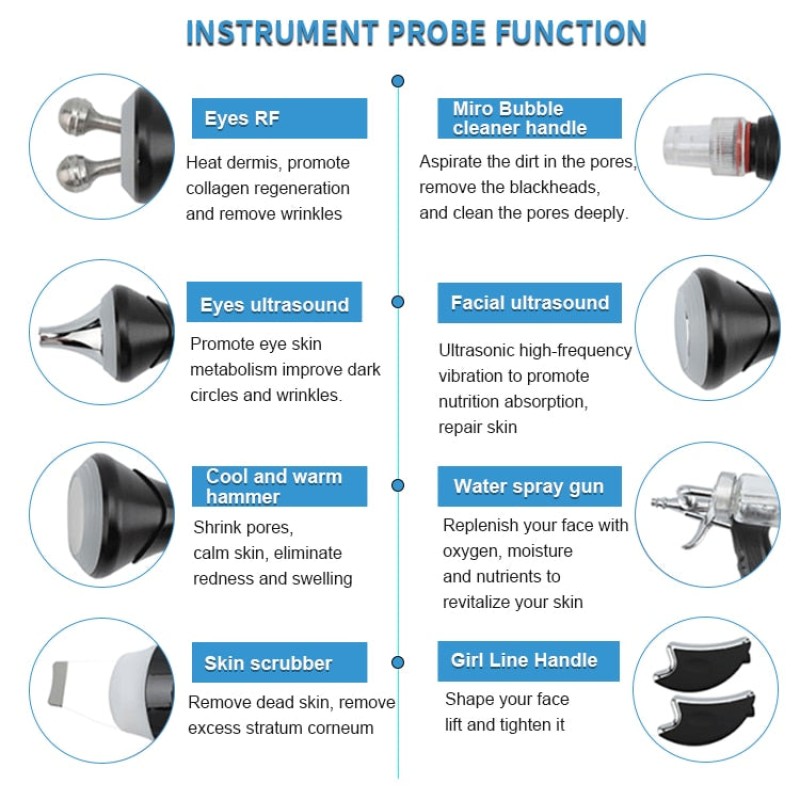 - Facial Ultrasound Head: Promotes rapid skin tissue regeneration, reduces facial wrinkles, and leaves your skin smooth and soft.