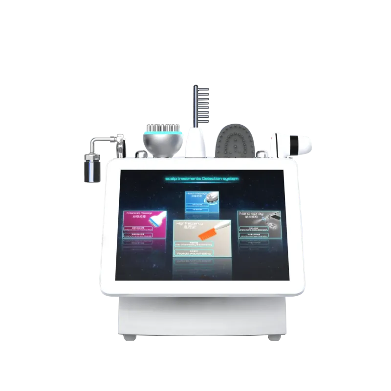 The High Frequency Hair Scalp Massager features five essential tools in one: an HD Scalp Detector, Meridian Brush (Vibrator), Comb, Silicone Massager, and Sprayer. Each component is engineered to address specific scalp and hair concerns, ensuring optimal results. The HD Scalp Detector, equipped with 50x and 200x magnifying lenses, allows you to closely examine your scalp condition on a 7-inch screen. The Meridian Brush uses micro-electric massage to unclog hair follicles, promote blood circulation, and balance scalp secretions, while the Comb utilizes thermal effects and anaerobic properties to combat bacteria and inflammation. The Silicone Massager, with its high-frequency vibration, helps relieve fatigue and enhances the absorption of active ingredients. Finally, the Sprayer precisely delivers serums and essences to your scalp for targeted treatment.