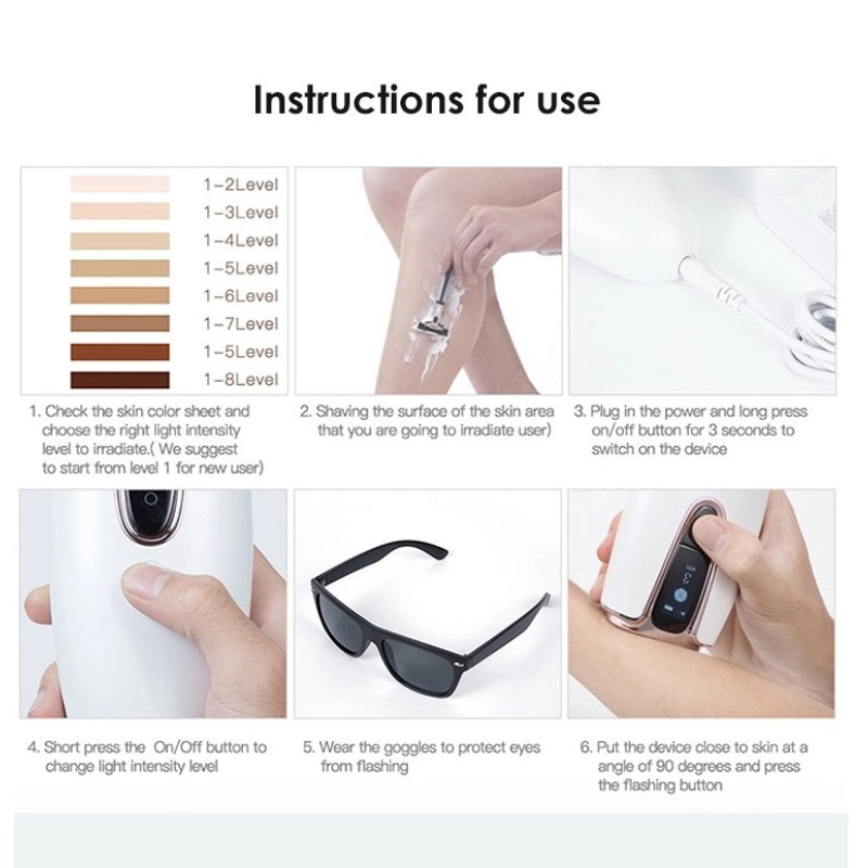 • Customizable Settings: Choose from 8 adjustable light energy levels to suit your skin's sensitivity. The built-in skin color sensor ensures safe and effective treatment for all skin types.
