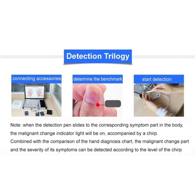 - Detection: Insert the pole jack into the probe hole and attach the window patching to the wrist. Turn on the detection switch and locate the datum mark by moving the detective pen around the Acupoint Shaoshang. The device will indicate potential health issues with orange lights and beeps.