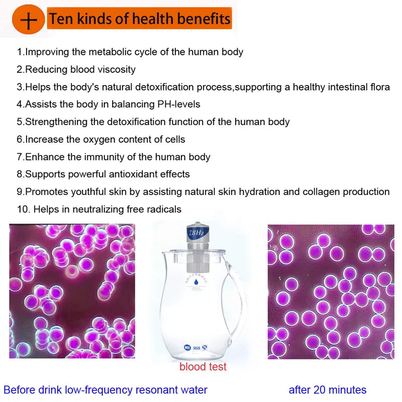 • 7.8Hz Low Frequency Resonance: Utilizes spin quantum resonance technology to alter the structure of water molecules, enhancing their bioavailability.