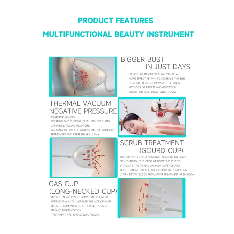 - Versatile Applications: Comes with multiple attachments for breast enlargement, hip lifting, cupping, scraping, face treatment, blackhead removal, and private parts care.