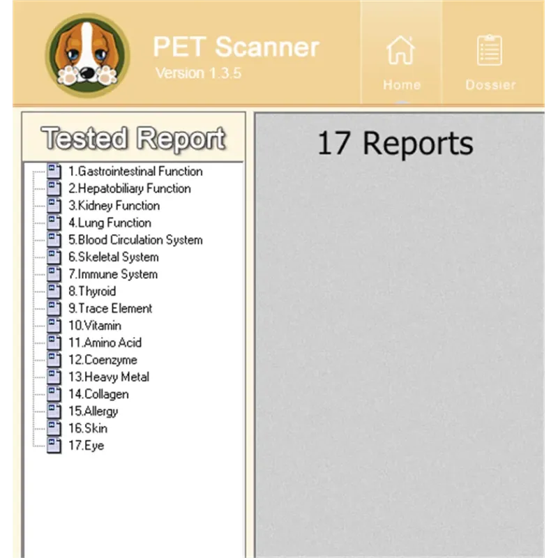 **Key Features** - **Quick Health Assessment**: Get detailed health reports in less than three minutes. - **Non-Invasive Technology**: Safe and comfortable for your pet with no need for blood tests or physical interventions. - **Multilingual Support**: Available in multiple languages including English, Spanish, French, German, and more. - **Comprehensive Reports**: 17 different health reports covering all major body systems and functions. - **User-Friendly**: Simple to operate, making it suitable for both home and professional use.