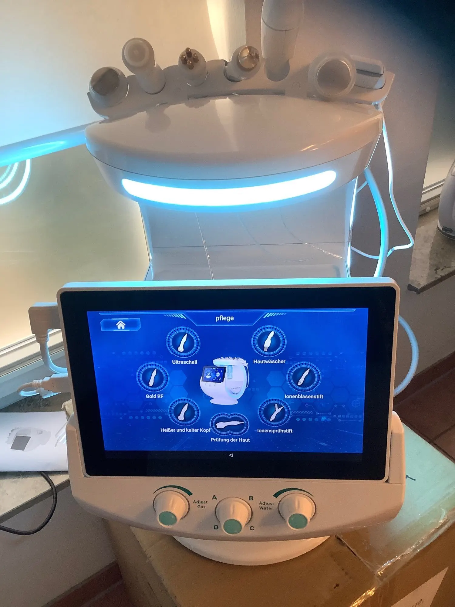 This multifunctional device combines advanced techniques including ultrasonic shovel knife, bubble, nano atomization, ultrasonic wave, gold radio frequency, and ice repair to provide a holistic skin management solution. It supports multiple languages including Chinese, English, Polish, Spanish, Russian, German, Turkish, Italian, French, Portuguese, Japanese, and Arabic. The device comes with a power plug and voltage suitable for your country.