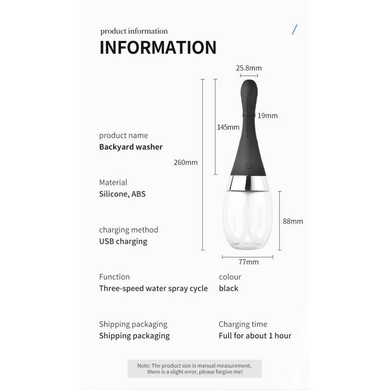 - 인체공학적 디자인: 가느다란 노즐은 삽입하기 쉽고, 타원형 관장 벌브는 편안한 그립을 위해 디자인되었습니다. 최대 250ml의 물을 담을 수 있으며, 노즐과 벌브는 모두 분리 가능하여 세척과 건조가 쉽습니다.