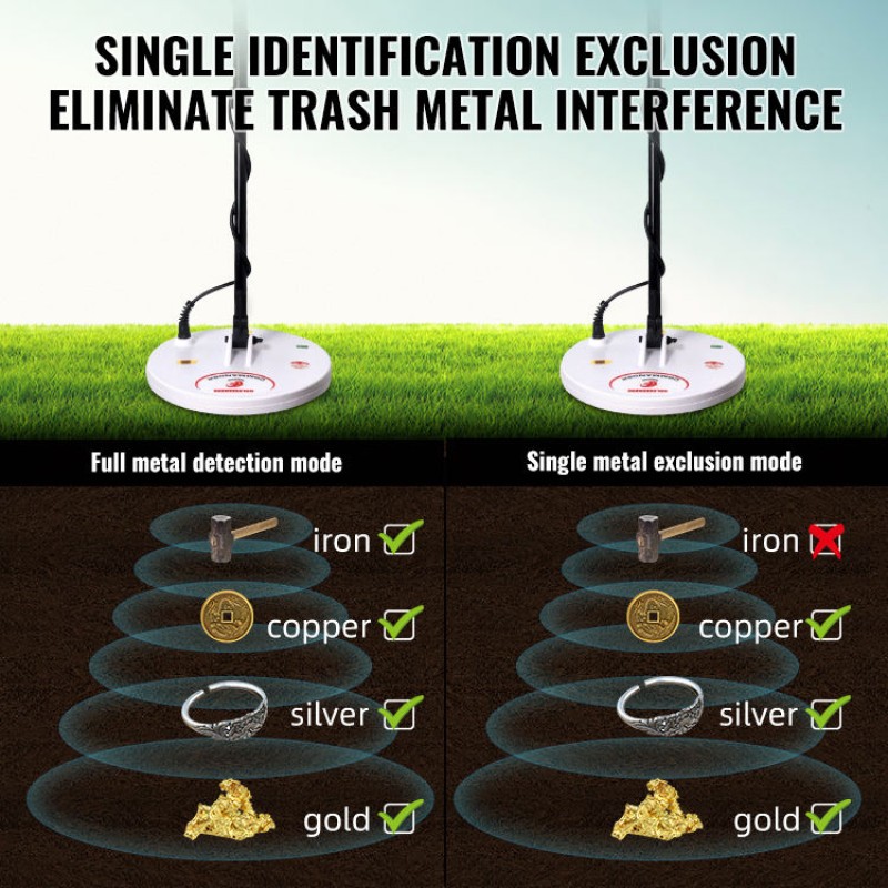 - 모든 금속 탐지 모드: 지상에 있는 모든 유형의 금속 물체를 검색하는 데 적합하며 철 금속과 비철 금속을 구별할 수 있습니다.