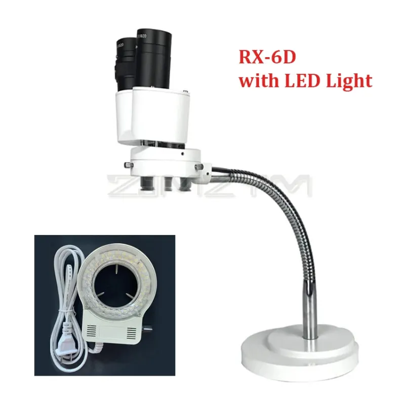 Ervaar precisie en helderheid met de 8X Stereo Microscoop RX-6D, ontworpen voor professionals in de tandheelkunde, elektronica en meer. Deze hoogwaardige binoculaire microscoop beschikt over een instelbaar LED-licht en een robuuste metalen basis, wat zorgt voor optimale kijkomstandigheden voor gedetailleerde taken.