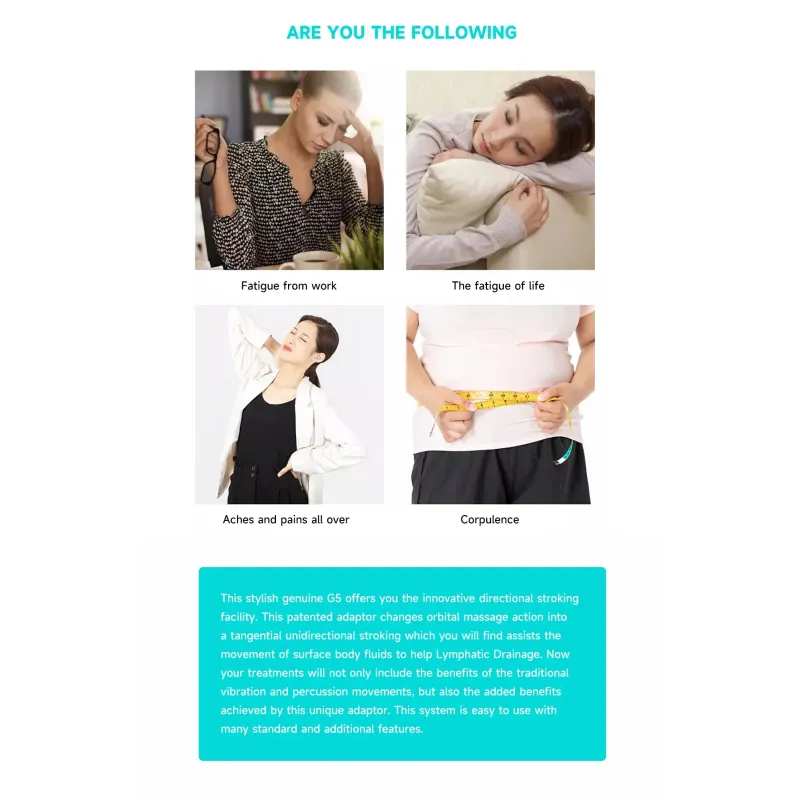 - 5-in-1 functionaliteit: combineert trillingen, percussie en lymfedrainage voor een uitgebreide lichaamsbehandeling.