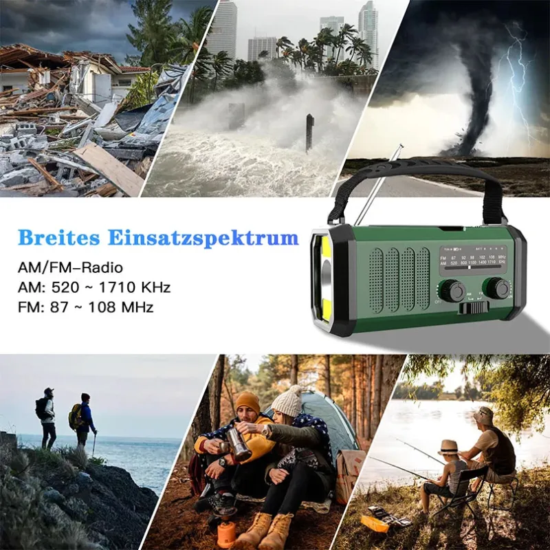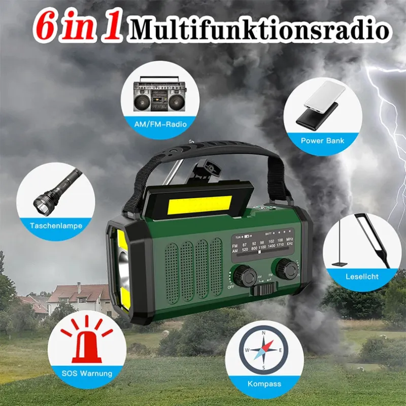 - Multifunctioneel apparaat: een 6-in-1-apparaat met een weerradio, LED-zaklamp, powerbank, SOS-alarm, leeslampje en kompas.