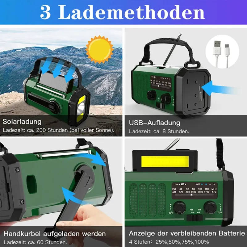- Verschillende oplaadmethoden: opladen via USB, zonne-energie of met een handmatige slinger voor betrouwbare stroomvoorziening in elke situatie.