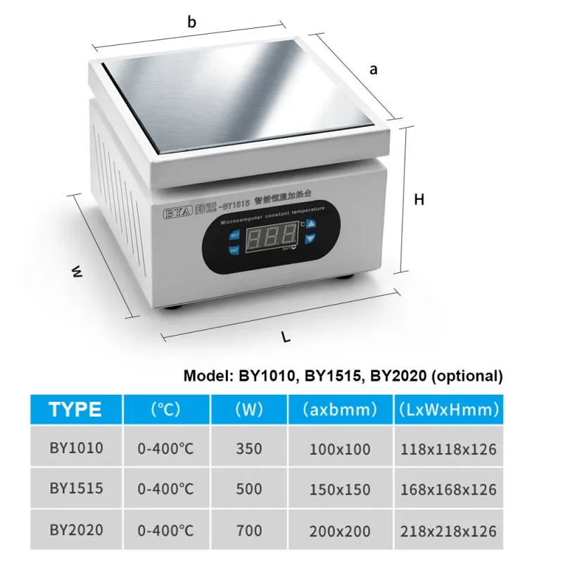 • BY1515: Heating plate size: 150*150mm / 5.91 * 5.91in, Temperature range: 0-400℃, Power: 500W