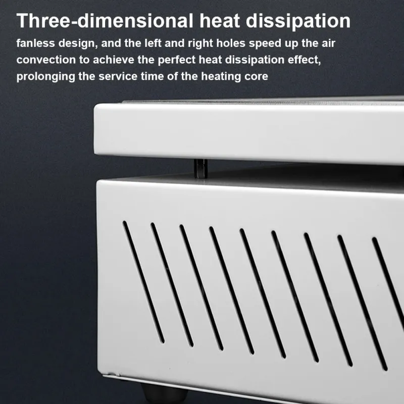 • Efficient Heat Dissipation: The three-dimensional heat dissipation system, combined with fanless design and side ventilation holes, enhances air convection for effective cooling, prolonging the lifespan of the heating core.