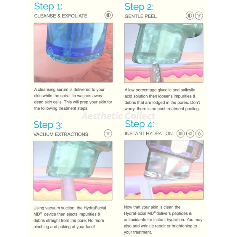 På mindre än en timme rengör Hydrodermabrasion-processen, exfolierar och infunderar serum i huden, vilket ger överlägsna resultat. Dessa inkluderar ökat blodflöde, stimulerad kollagenproduktion och djup återfuktning och näring. Varje session kan anpassas med en cocktail av serum som är skräddarsydda för att möta alla hudbehov, vilket gör den mångsidig för fet, tilltäppt, torr eller uttorkad hud.